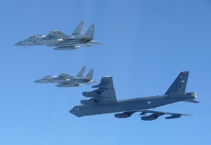 【画像は、米軍のB52爆撃機(右下)と航空自衛隊の戦闘機】 |