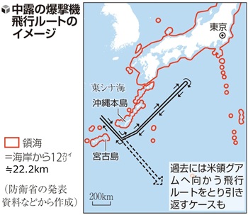 中国、ロシア両軍の爆撃機が9日に沖縄本島・宮古島間を抜けて太平洋まで共同飛行した際、太平洋に出た後に東京方面へ向かう異例のルートをとっていたことが分かった。中国軍機は核巡航ミサイルを搭載可能な改良型の戦略爆撃機だった。