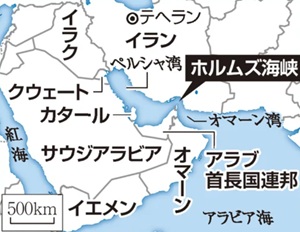 【右画像はホルムズ海峡近くの湾内を航行するタンカー。記事全文はこちら】 |