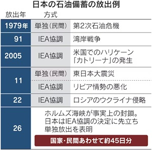 経済産業省によると、今回の放出は民間備蓄と国家備蓄をあわせて約8000万バレルを見込む。日数でみると過去最多の45日分となる。 |
