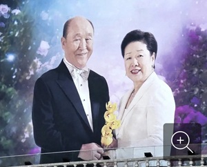 【世界平和統一家庭連合(旧統一教会)の創始者、文鮮明氏と、妻の韓鶴子総裁の写真。教団施設の壁面に掲げられていた】 |