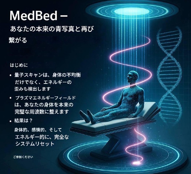 MEDBED – 本来のブループリントと再び繋がる 【「ブループリント」は、本来は「青焼き図面」を意味し、そこから転じて「詳細な計画」「設計図」「将来の構想」全般を指す言葉。ここでは「設計図」の意味。 佐野美代子さんの『Truth Seekers Ⅱ』(※10, p.214)によると、メドベッドによる治療はDNA情報に基づき行われるのではなく、自らが持っている「エーテル体の設計図」に基づいて行われると記されている。こちら】 ⸻ もし癒しがダメージの修復ではなく、完璧さを再び目覚めさせることだとしたらどうでしょう? もしすべての細胞の中に、病気やトラウマ、時間そのものに左右されない、完全性の記憶、神聖なコードが存在するとしたらどうでしょう? それがMedBedシステムの真髄です。 治療ではなく、回復のために設計された量子生物学的インターフェースです。 従来の意味での癒しではなく、あなたの体に真のあなたを思い出させます。 ⸻ ●量子バイオレゾナンススキャン あなたの肉体、感情、エネルギーの層を360°量子マッピングし、バイオフィールド、細胞記憶、形態形成コードの歪みを検出します。 病気だけでなく、断絶も捉えます。 ●プラズマエネルギー再調整 超コヒーレントプラズマフィールドを通して、あなたの周波数は、干渉、毒素、あるいは感情的なトラウマによって信号が変化する前の、本来の遺伝子テンプレート、つまり純粋な振動パターンに再調整されます。 ●細胞記憶の再活性化 光を注入したスカラーインパルスがミトコンドリアの知性と直接通信し、細胞を本来の設計、つまり若さ、活力、そして自己修復力を備えた状態へと再起動させます。 ⸻ ✨ 結果: 身体的、感情的、そしてエネルギー的に、システム全体がリセットされます。 ホルモンバランス、臓器機能、神経同期、そして感情の明晰さはすべて、最適な調和状態に戻ります。 あなたの体は調律された楽器となり、完璧な周波数で再び振動します。 ⸻ 🌌これは医学ではありません。 🌌これはSFではありません。 🌌これは記憶です。本来の設計図への回帰です。 ブループリントはあなたを記憶しています。 周波数が戻ってきています。 @MedBedsTechnologyNews(https://t.me/m2ensenChannel/34751) |