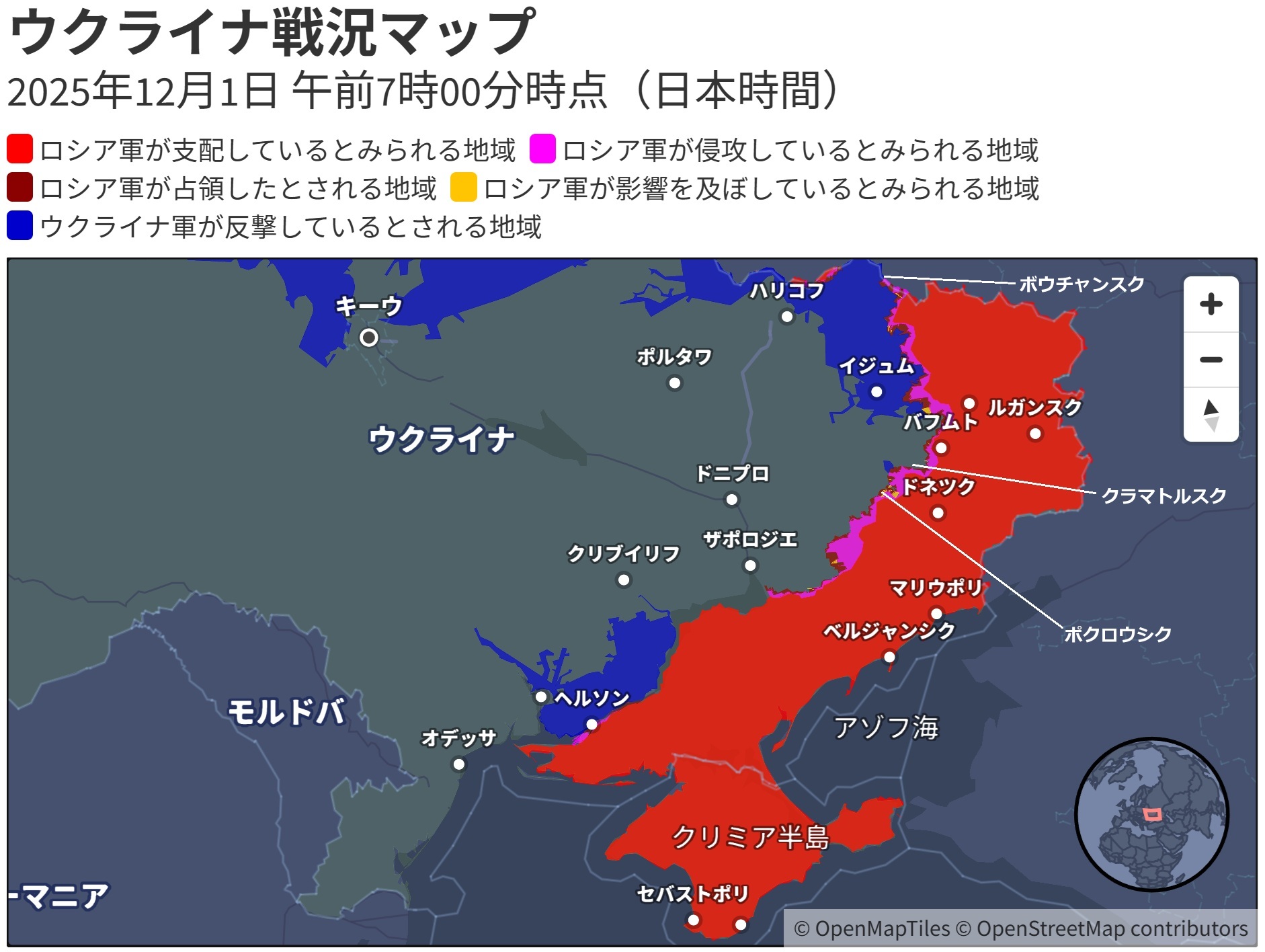 プーチン大統領が11月30日夜に作戦司令部の一つを訪問した際、ゲラシモフ軍参謀総長が「解放」について報告した。東部ハルキウ州の対ロ国境に近いボウチャンスクも支配下に置いたという。