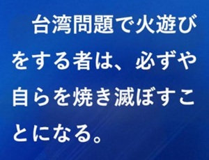 同大使館は青い背景に白い大きな文字が書かれた画像を掲載。そこには大きな文字で「台湾問題で火遊びをする者は、必ずや自らを焼き滅ぼすことになる」と日本語で記されていた。