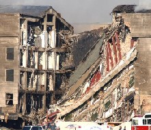 なお、ペンタゴンの建物について、航空機が激突したとされる部分の上部は、 右写真(写真2)にように激突後約20分後に崩れ落ちた。右写真もクリックすると別画面で拡大表示する。 (写真1)では建物の上部はまだ崩壊していないので、建物の写真は激突直後の写真ということになる。 |