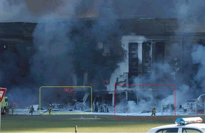 左の写真(写真3)もクリックすると、別画面で拡大表示する。この写真は、(写真1)と同じように、建物の上部はまだ崩壊していないので、航空機(?)が激突した直後の写真と言える。 拡大写真の左側の黄色い枠で囲った部分にアメリカン航空77便(ボーイング757-200型機)が突入したとされているが、そのような大きさの穴は全く空いていない。 また、突入したとされる航空機の機体の残骸や、乗客の座席、荷物などが全く見られない。 更に、建物の前の芝生が無傷であることも見て取れる。 ボーイング757型機は地上に全く接触せず、地上数メートルという超々低空飛行でペンタゴンに突入したことになる。 なお、建物の前に転がっているケーブルを巻き付けるような円形の物は、911事件の前から建物の前に放置してあった物です。 |
