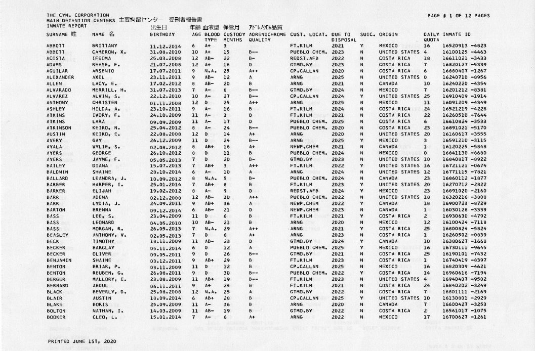 ● 子供を使った製法 「アドレノクロム」に関して、最大の問題はその「製法」と言える。 化学合成によっても生産可能だとも言われているようだが、今回「エプスタイン島」等で行われていた製法は、小さな子供を利用する製法。 大人よりも小さな子供の方が純度の高い「アドレノクロム」が入手出来ると言われている。 そしてその「製法」だが・・・余りにも悲惨なので、以下にリンクを張っておく。 https://shunsasahara.com/entry/2020/07/30/234911 上のページの「アドレノクロムの恐るべき採取法」をご参照頂きたい。 「アドレノクロム」は一種の脳内麻薬と言える。 肉体が激しい苦痛や恐怖に襲われたとき、人間の「本体」である「魂」を守るために、松果体から分泌される物質。 これは我々を創ってくれた神の恵。 それを悪党どもが悪用したと言う訳。 ● アドレノクロム製造所関連資料 普通の日本人には到底信じられない世界なので、資料を一つ掲示しておく。 文字が小さくて見にくいので「画像」をクリックすると別画面で拡大表示する。 ![]() 上の資料から、子供の年齢(AGE)が「6歳から12歳」であることが分かる。 「custody months」とはその子供が捕らわれている月数。 最長36か月、3年のようだ。 アドレノクロムの「質」(QUALITY)まで記載されている。 このページには44人が記載されており、全部で12枚あるようなので、少なくとも 44人×11=484人 もの子供がここに捕らわれているのだろうか!? 確か、アメリカだけでも約200箇所も、このような「製造所」があったと聞いた記憶がある。 既にそのほとんどの施設が破壊され、捕らわれていた子供達も救出されていると聞いているし、そう願わざるを得ない。 |