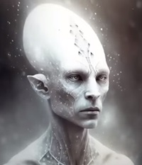 【左画像はオレラ族。旧5種族評議会の一員。トール・グレイの生命体。非常にスリム。細くて長い首。 三角形の頭。切れ目のある口、ほとんど見えない鼻腔。 瞳孔のある斜めの目。蛇遣い座。 非常に聡明。銀河連合の高等評議会における平和大使。 もはや生殖のための交尾はしない。新しい有機体の体を製造し、魂を吹き込む】 イメージ画像は、こちらの記事にあります。 |